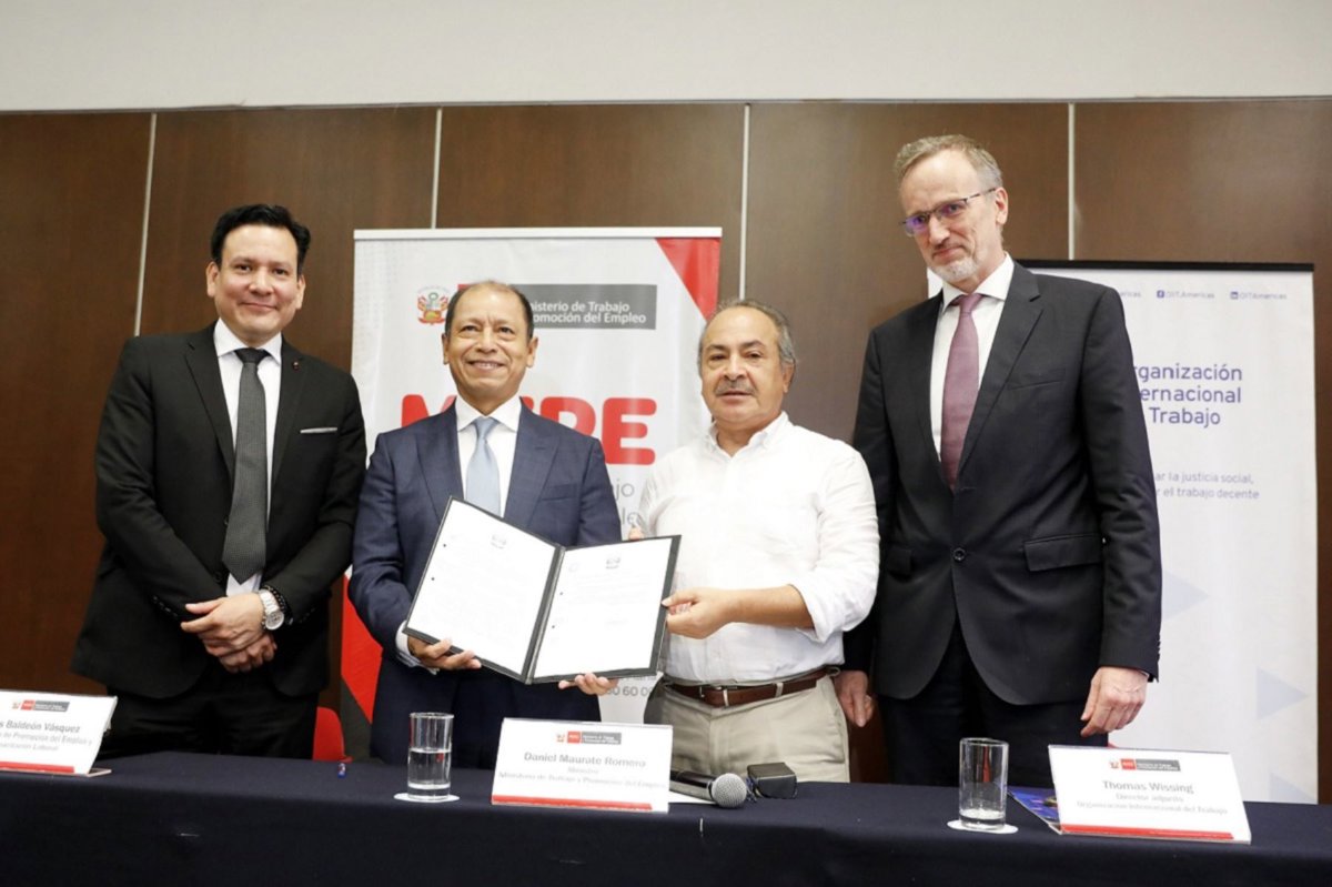 La ceremonia de suscripción se llevó a cabo en el Auditorio de la Organización Internacional del Trabajo (OIT) y contó con la presencia del ministro de Trabajo, Daniel Maurate Romero, el viceministro de Promoción del Empleo y Capacitación Laboral, Jesús Baldeón, el presidente de la Central Unitaria de Trabajadores del Perú (CUT), Julio César Bazán, y el director adjunto de la OIT para los Países Andinos, Thomas Wissing, entre otras autoridades.
