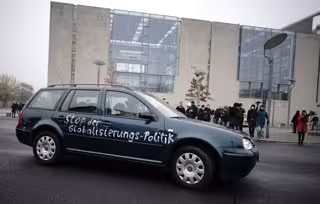 25 November 2020, Berlin: A fireman at the wheel removes a car, which crashed stands in the gate of the Federal Chancellery, with inscription on the door : Stop the policy of globalization. Photo: Michael Kappeler/dpa - Michael Kappeler/dpa